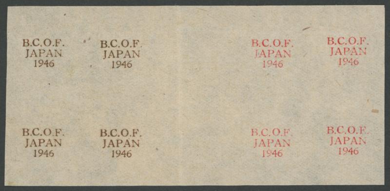 TYPE ONE (THIN OVERPRINT) ON PLAIN PAPER: Inter-panneau piece (100x48mm) with 8 impressions - 4+4 - comprising left-hand pane [Rows 3/4 Pos 7 & 8] in gold and right-hand pane [Rows 3/4 Pos 1 & 2] in red, minor wrinkles & central vertical fold clear of the impressions, Cat $1400+ for singles plus a significant premium for the two se-tenant pairs. Sybrand Bakker's similar block of 8 from the top of the sheet sold for $1105 (Sale 184 Lot 1522). (Image1)