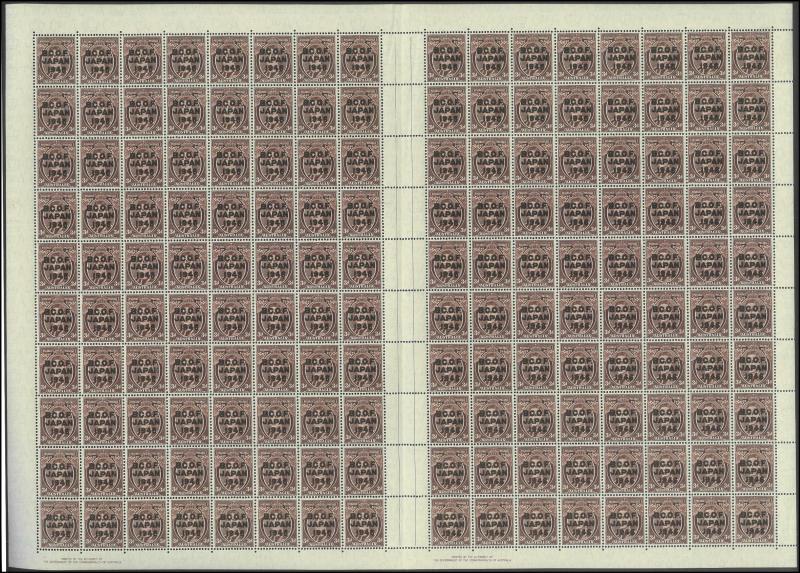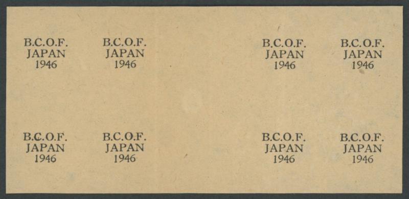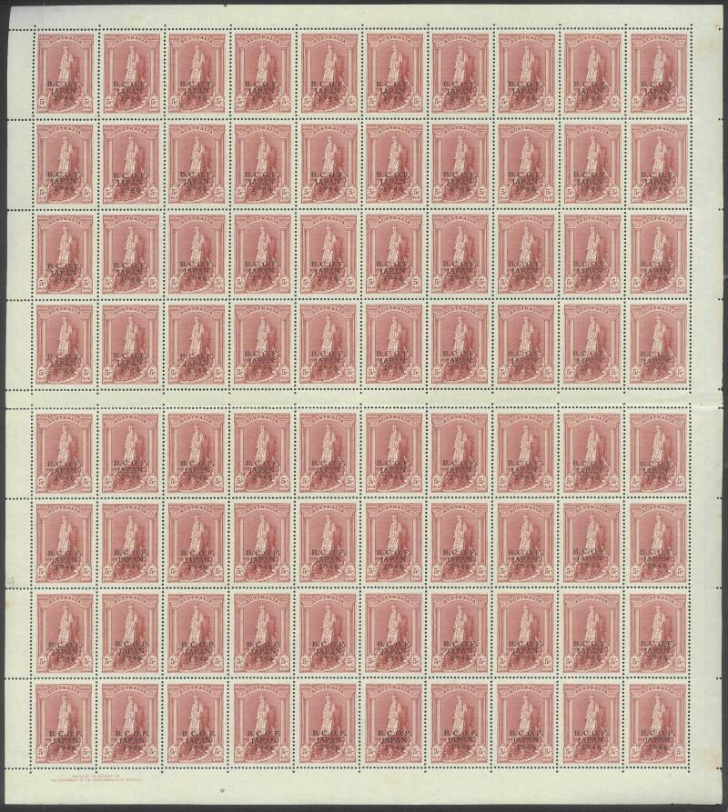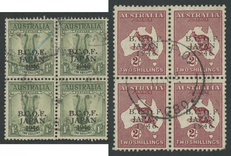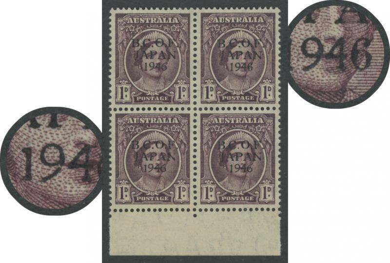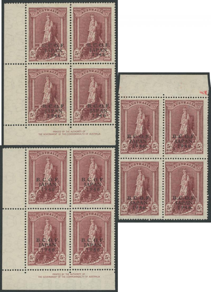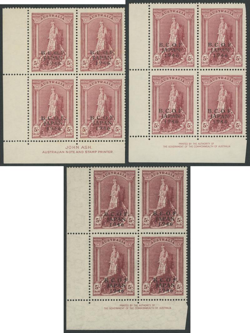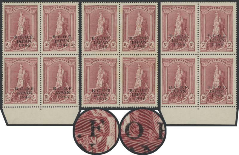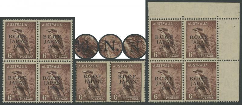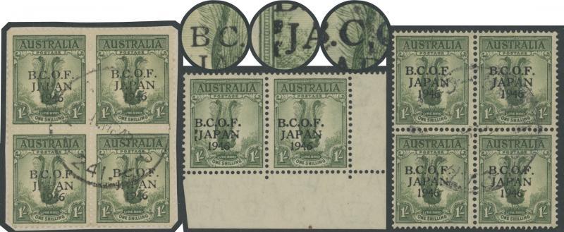 ONE SHILLING: 1/- Lyrebird annotated selection on display pages including blocks of 4 and 8 (minor toning) both with Wrong (Antique) Font '6' and Short '1' ACSC J5h (SG J5a) & i, block of 4 with Wrong Font (Narrow) 'N' J5j (SG J5c), postally used blocks of 4 with Comma after 'C,' or No Stop after 'B ' in 'B C.O.F.' and mint pair with Colon before ':JAPAN' all of which are constant varieties that should be listed in the ACSC, Overprint Misplaced to Upper-Right single, to the Base two blocks of 4 and to Lower-Left two imprint blocks of 4, five other imprint blocks of 4, etc, generally very fine and mostly mint with many units being unmounted.