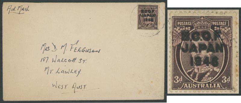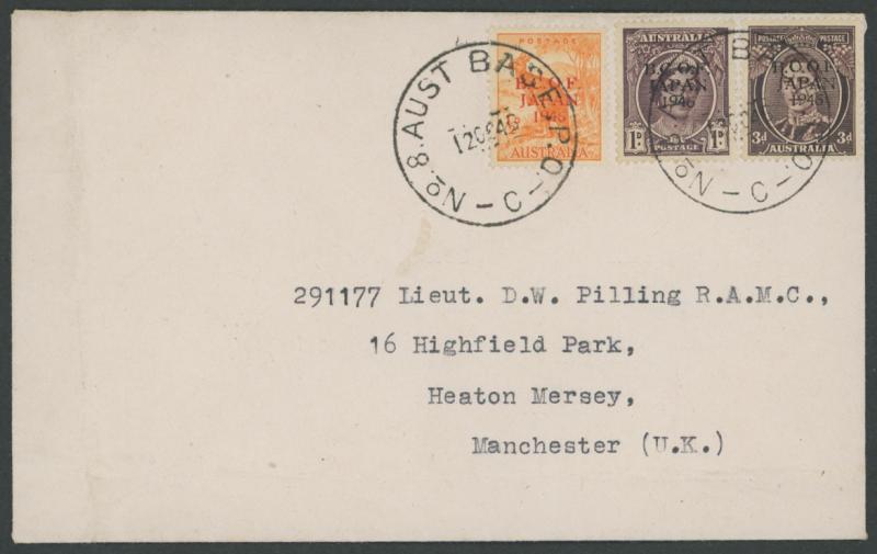 TYPE ONE (THIN OVERPRINT) ON STAMPS: ½d in Red, 1d in Black and 3d in Black ACSC J1PP(1)A, J2PP(2)A and J3PP(2)A tied to a plain cover by 'No 8 AUST BASE PO/12OC46/ C ' cds in use at BCOF HQ at Kure, vertical fold at left & horizontal fold at the base but very fresh and the stamps are very fine, Cat $2250 for used; unpriced on First Day Cover (SG Cat £525 for unmounted mint in a footnote below SG J7a; unpriced used). The ACSC states "Date of issue: 12 October 1946 (½d 1d & 3d) but withdrawn several days later", because formal approval for these stamps had not been received from Australia. (Image1)