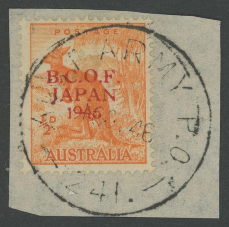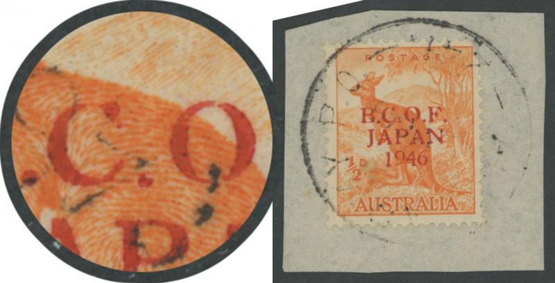 HALFPENNY WITH OVERPRINT IN RED: ½d in Red ACSC J1PP(2) tied to small piece by 'AUST ARMY PO/ 241. ' cds used at BCOF HQ at Kure, Cat $750. (Image1)