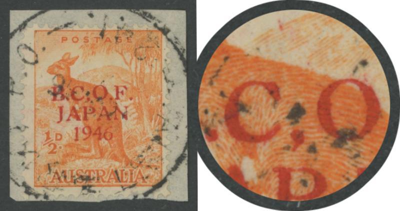 HALFPENNY WITH OVERPRINT IN RED: ½d in Red ACSC J1PP(2) with unlisted variety Small Stop after 'C' tied to small piece by 'AUST ARMY PO/ 241. ' cds used at BCOF HQ at Kure, Cat $750+. (Image1)
