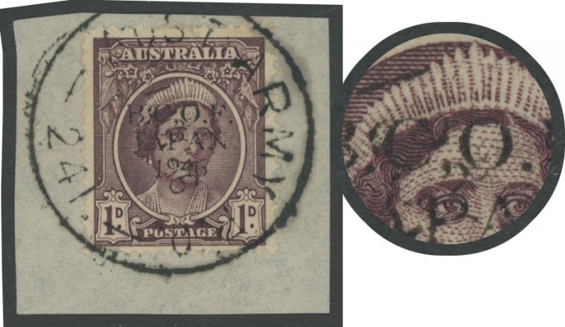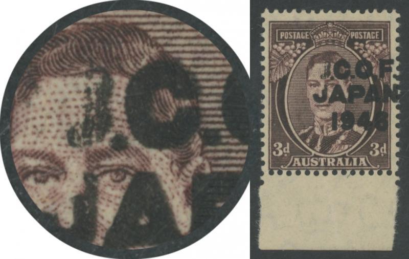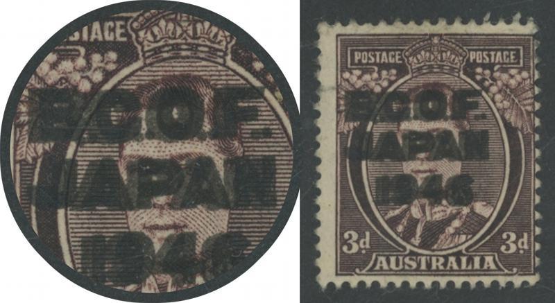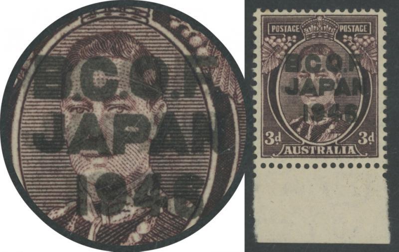 PENNY WITH OVERPRINT IN BLACK: 1d in Black with Major Variety 'P.C.O.F.' ACSC J2PP(2)Ad tied to small piece by 'AUST ARMY PO/ 241. ' cds used at BCOF HQ at Kure, undercatalogued at $1250 mint; unpriced used. Absent from Sybrand Bakker's collection.
