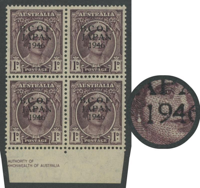 PENNY WITH OVERPRINT IN BLACK: 1d in Black with '1' in Wrong Font ACSC J2PP(2)Ai being the lower-right unit in a part-imprint block of 4, unusually well-centred, unmounted, Cat $1400+ for unmounted normal singles. (Image1)