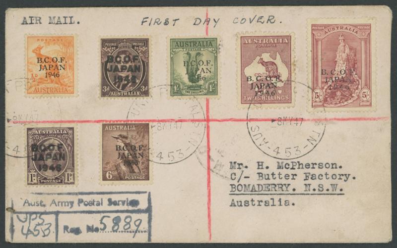 ½d to 5/- Thick Paper (well-centred) tied to plain envelope by 'AUST UNIT POSTAL STN/8MY47/ 453 ' cds with rubber boxed registration cachet & endorsed at top "FIRST DAY COVER", 'BOMADERRY/17MY47/NSW' arrival backstamp, very minor blemishes. Scarce registered FDC. (Image1)