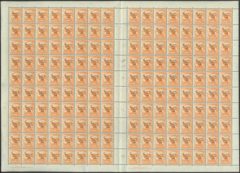 HALFPENNY: ½d Kangaroo ACSC J1 (SG J1) complete sheet of 160 comprising two panes of 80 (8x10) from the First Setting (State 3) with both imprints and including the major varieties 'B' & First 'A' in Narrow Font [L4/5], '6' in Antique Font [L9/4], Short '1' [L10/3], Narrow 'N' [R1/8], Second 'A' & '4' in Wrong Fonts [R3/4], Narrow 'B' [R7/6] ACSC J1g-k & m but without Stop after 'JAPAN.' J1L, folded in the gutter, some blemishes in the margins but the stamps are generally very fine unmounted, Cat $2235+ for singles and the imprint blocks (£1800+ for singles). A scarce sheet. (Image1)