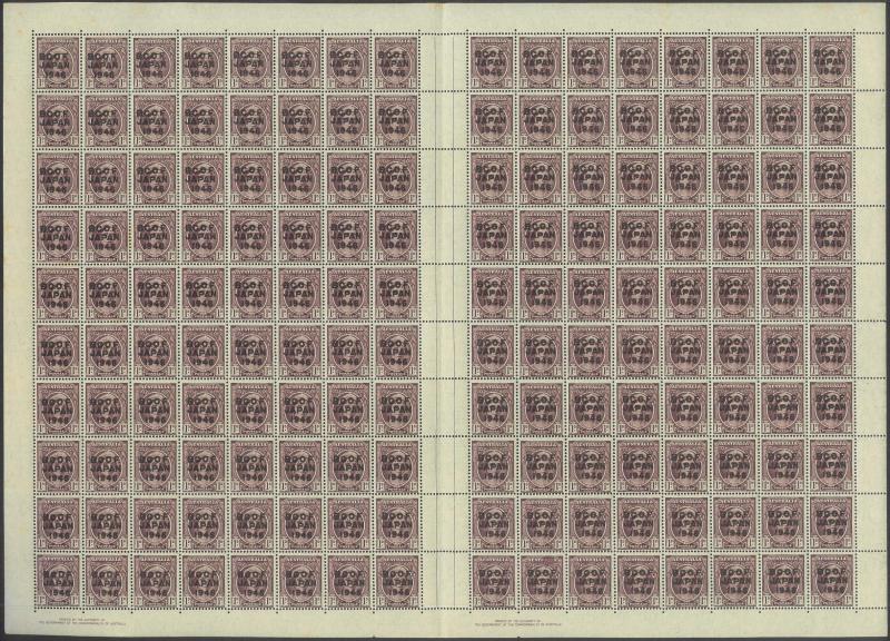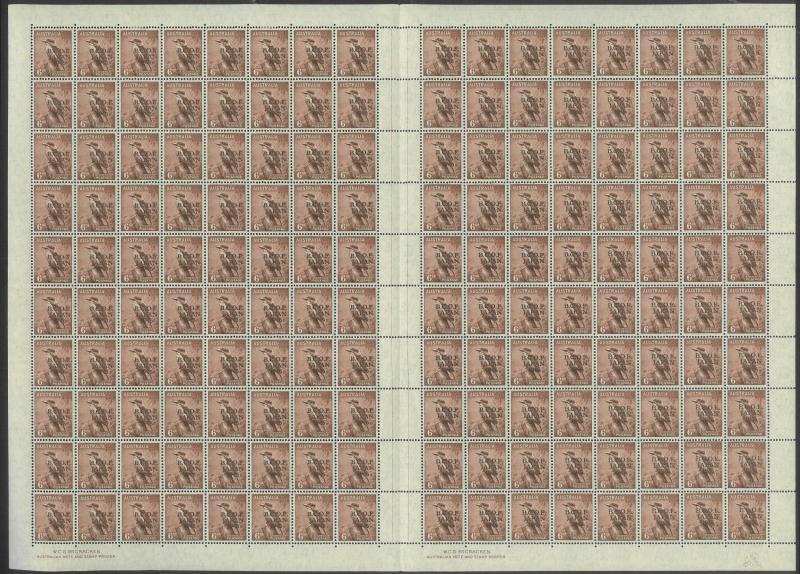 SIXPENCE: 6d Kookaburra ACSC J4 (SG J4) complete sheet of 160 comprising two panes of 80 (8x10) from the First Setting (Third State) with both imprints and including the major varieties 'B' & First 'A' in Narrow Font [L4/5], '6' in Antique Font [L9/4], Short '1' [L10/3] and Narrow 'N' [R1/8] ACSC J4g-j but without Second 'A' & '4' in Wrong Fonts [R3/4], Stop after 'JAPAN.' [R5/5] and Narrow 'B' [R7/6] J4k-m, folded in the gutter, a few normal units mounted otherwise very fine to superb unmounted, Cat $4480+ for singles and the imprint blocks (£5180+ for singles). A rare sheet. (Image1)