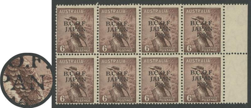 SIXPENCE: 6d Kookaburra marginal block of 8 (4x2) from the right of the sheet, the upper-left unit with Stop after 'N.' of 'JAPAN' ACSC J4L (SG J4b), one normal unit lightly mounted otherwise unmounted, Cat $800+ (£625+) for singles. BPA Certificate (1989) also identifies Malformed 'C' (R5/8) and Broken Top to 'F' (R6/6). (Image1)