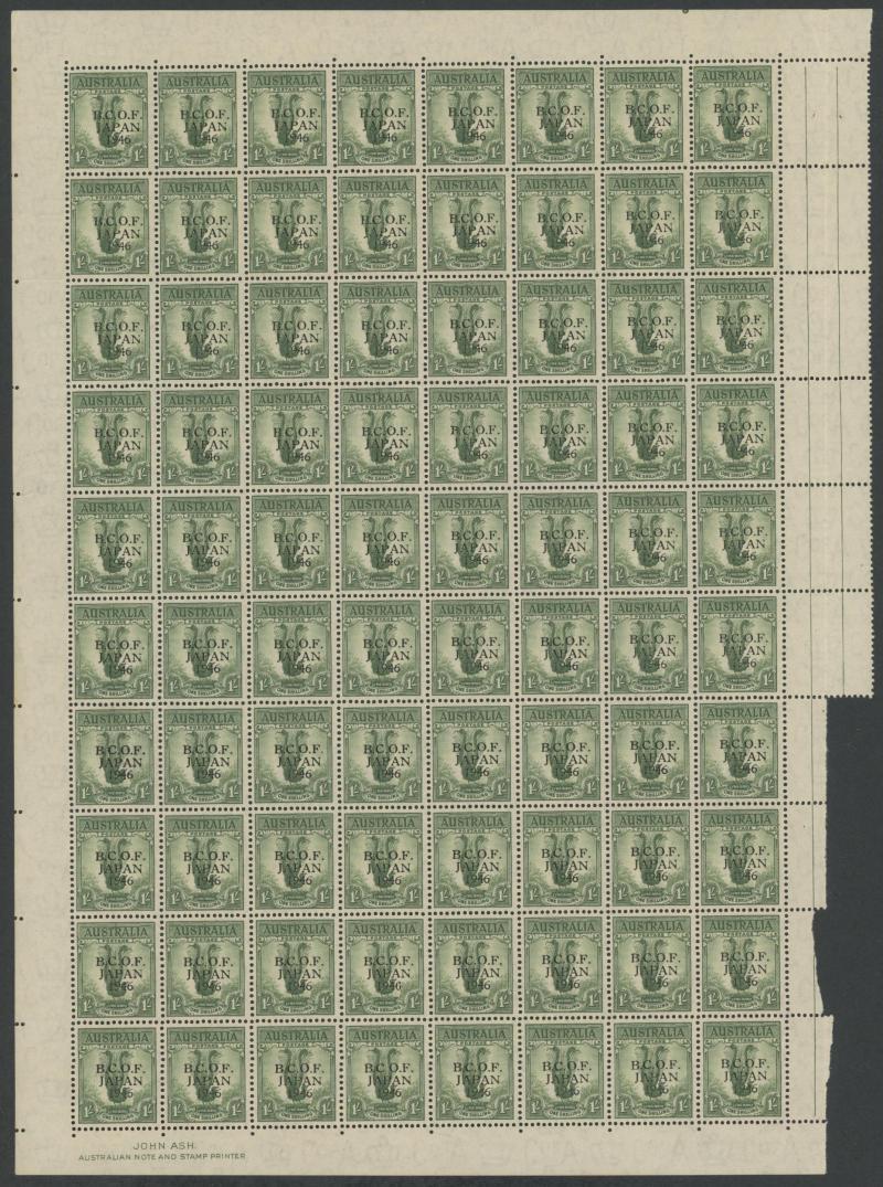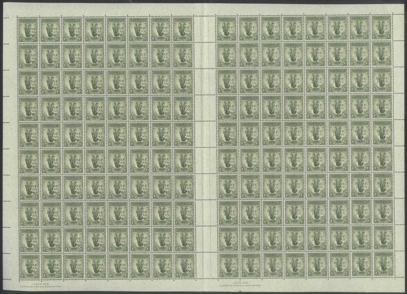 ONE SHILLING: 1/- Lyrebird ACSC J5 (SG J5) complete sheet of 160 comprising two panes of 80 (8x10) from the First Setting (Third State) with both imprints and including the major varieties 'B' & First 'A' in Narrow Font [L4/5], '6' in Antique Font [L9/4], Short '1' [L10/3] and Narrow 'N' [R1/8] ACSC J5g-j but without Second 'A' & '4' in Wrong Fonts [R3/4], Stop after 'JAPAN.' [R5/5] and Narrow 'B' [R7/6] J5k-m, folded in the gutter, a few normal units mounted otherwise very fine to superb unmounted, Cat $5275+ for singles and the imprint blocks (£3860+ for singles). Another rare sheet. (Image1)