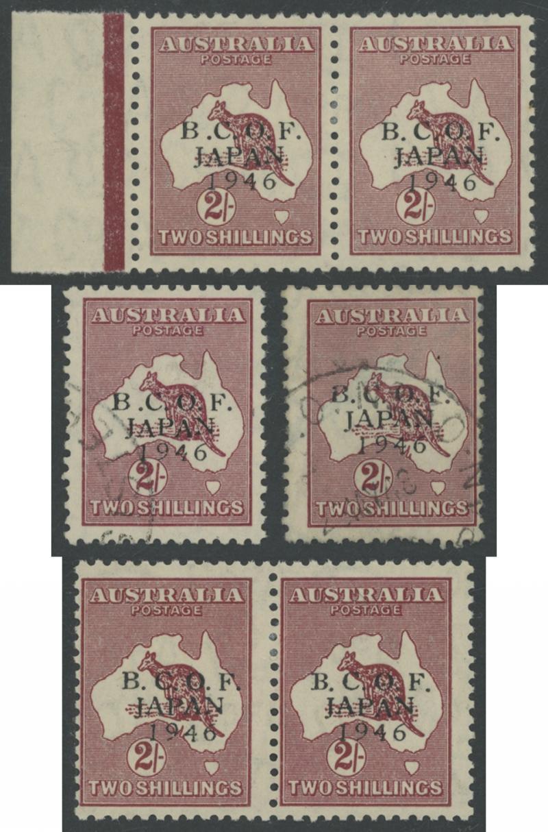 TWO SHILLINGS: 2/- Kangaroo annotated selection on display pages including Misplaced Stop after 'B .' ACSC J6d in mint pair & block of 4 and used single, Deformed 'B' J6e used plus varieties that should be listed in the ACSC Narrow 'B' in mint pair and Wrong Font '4' (no serif at the base) mint, Very Heavy Overprint two blocks of 4 (one unmounted), unmounted block of 12 (3x4), six imprint blocks of 4, etc. Gibbons don't list any varieties for the 2/-.