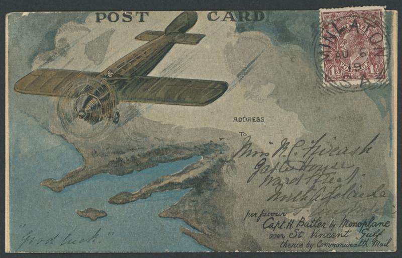 1919 coloured PPC for Harry Butler's flight from Adelaide to Minlaton with KGV 1½d brown cancelled on arrival by 'MINLATON/SA' squared-circle, printed message from Butler with photo & facsimile signature AAMC 20, minor corner bend, Cat $550 (2008). Sold at our auction of 24.6.2006 for $349 (Sale 122 Lot 418). (Image1)