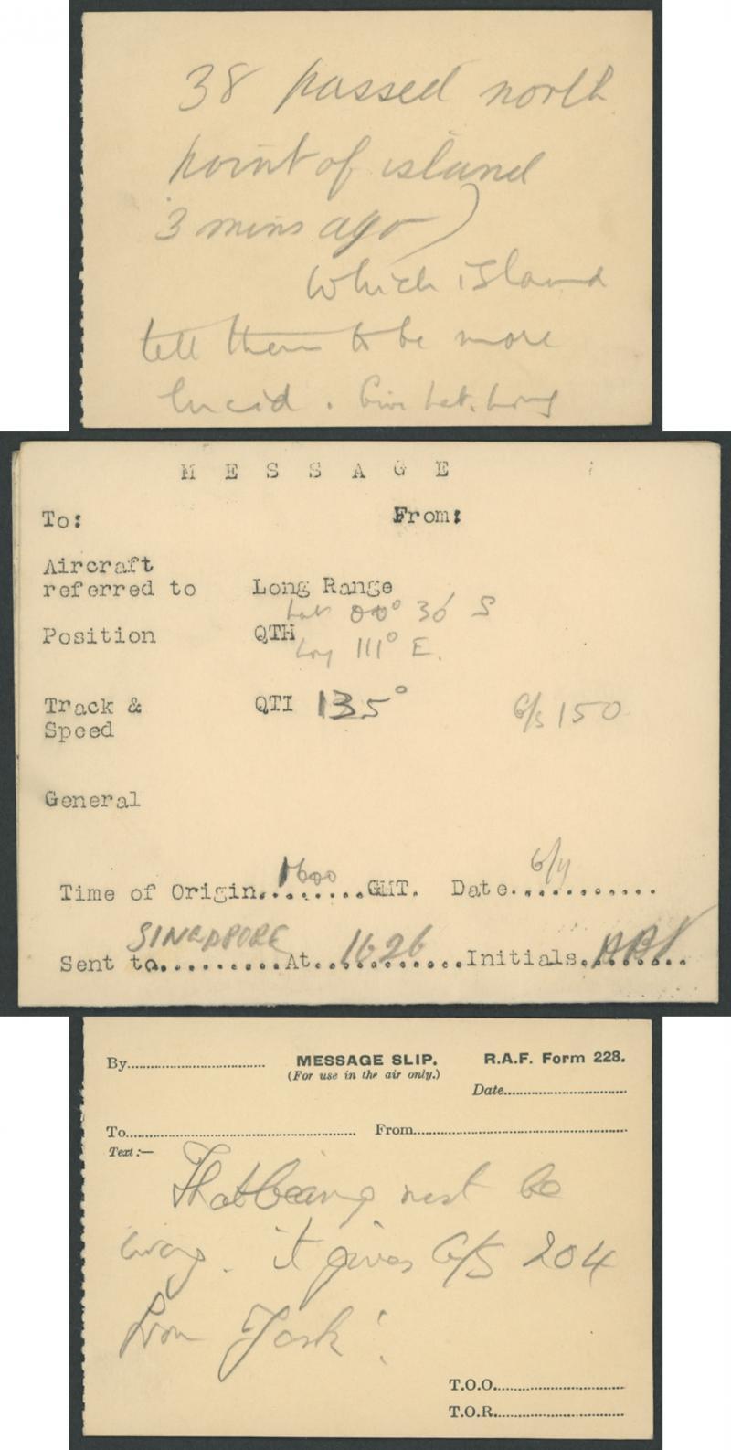 1938 Egypt-Australia Record Non-Stop Flight by Royal Air Force group of 52 messages passed between the crew members of Machine 80 and to/from Machines 38 & 39 mostly on 'Message Slip R.A.F. Form 228' cards or pre-typed message forms giving weather conditions, positions including in reference to Karachi & Singapore, etc, noted "Are we trying to dodge the storm?", "The sandwiches were bloody awful", and "38 passed north point of island 3 mins ago ... Which island tell them to be more lucid", also a few Air Mail etiquettes mostly British labels, condition a little variable but most are fine to very fine. Fascinating insight into on-board communications prior to radio.