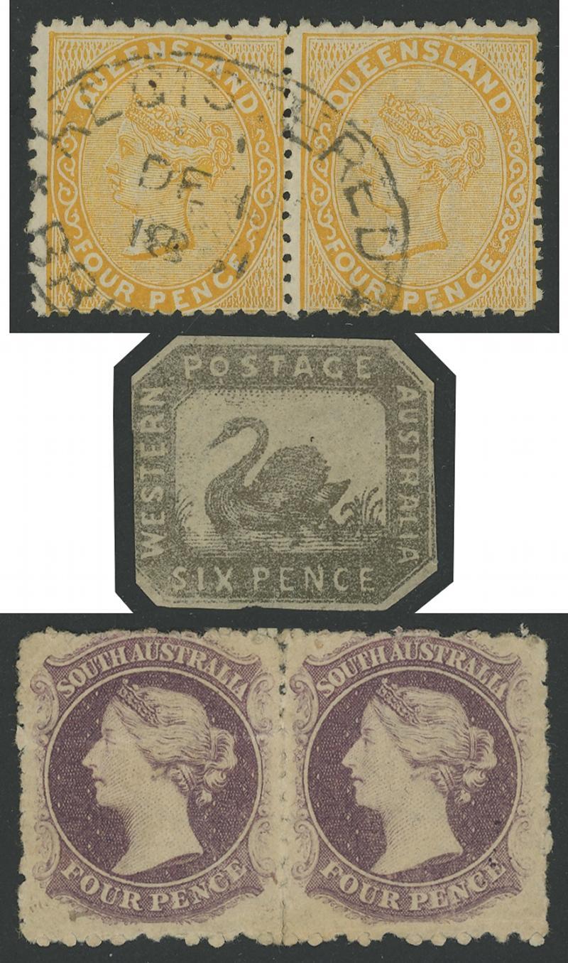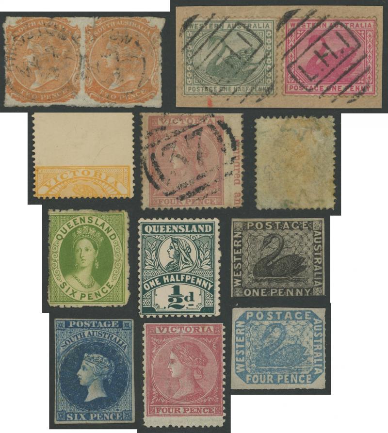 Fascinating lot with better items from NSW including Sydney Views 2d & 3d, Jubilee 2½d mint block of 10, primitive Stamp Duty to 2/-; Queensland including Chalon 6d with parts of Small Star & Truncated Star Watermarks on the same stamp!, Lined Background 1d pair apparently imperf vertically but with faked perfs, Widow Weeds ½d perforated plate proof, Stamp Duty Chalon 5/- & 10/- both apparently unused; South Australia including an apparently unused Imperf 6d SG 3, Perf 10 1d two strips of 3, De La Rue Rouletted 2d pair apparently Imperf Between; Victoria Laureates 4d with part-imprint 'hundred an[d]' inside the perfs & V/Crown 4d mint, ½d orange with Perfs Misplaced & 60% Void; Western Australia including apparently unused Penny Black (3 margins) & Litho 4d with faked roulettes; etc, also some postmarks including 'PO RAILWAY/JA2/1866/SA' on piece, 'LHI'-in-bars on WA ½d & 1d on-piece, 'HAY ST WEST/WA' on 8d, 'NUMBER SIX MILL' on 1d, 'GOLDFIELDS/TPO' on 1d pair; etc, condition variable and nothing has been expertised so necessarily offered "as is".