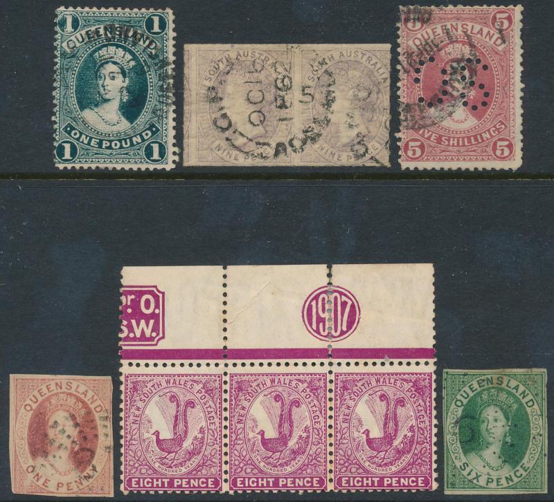 Modest collections of New South Wales to 2/6d Lyrebird x4 including 1905-10 8d Lyrebird strip of 3 with '1907' Monogram (**); Queensland including presentable Imperf 1d & 6d, Litho 4d lilac & 4d yellow x3, Large Chalons postally used to £1, range of low denomination mint singles & multiples including Adhesive Duty 2d block of 14 (7x2), punctured 'OS' selection to 5/-, etc; and South Australia with lots of Roulettes including 9d grey-lilac pair & 'TEN PENCE' on 9d x3, RoulettedxPerf 11½-12½ 'TEN PENCE' on 9d x2, Perf issues including '3-PENCE' on 4d x6 & 'TEN PENCE' on 9d x4; condition rather mixed but many are fine to very fine.