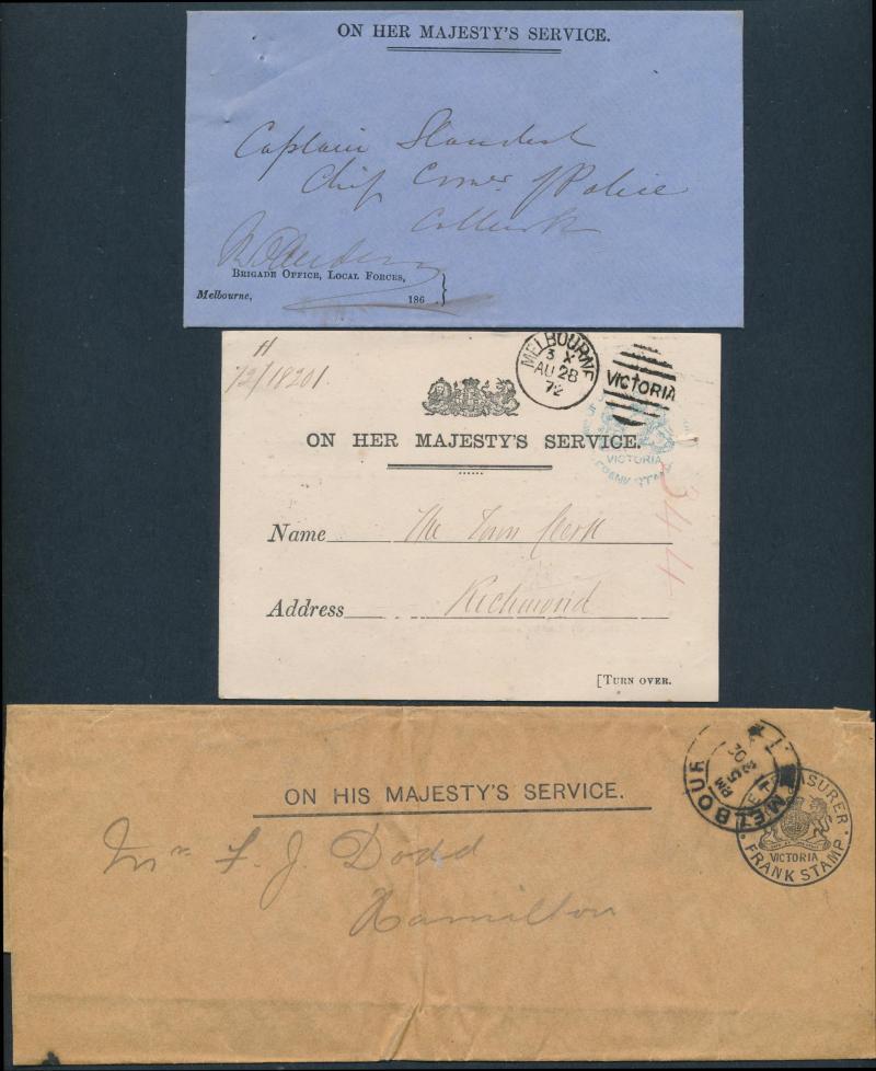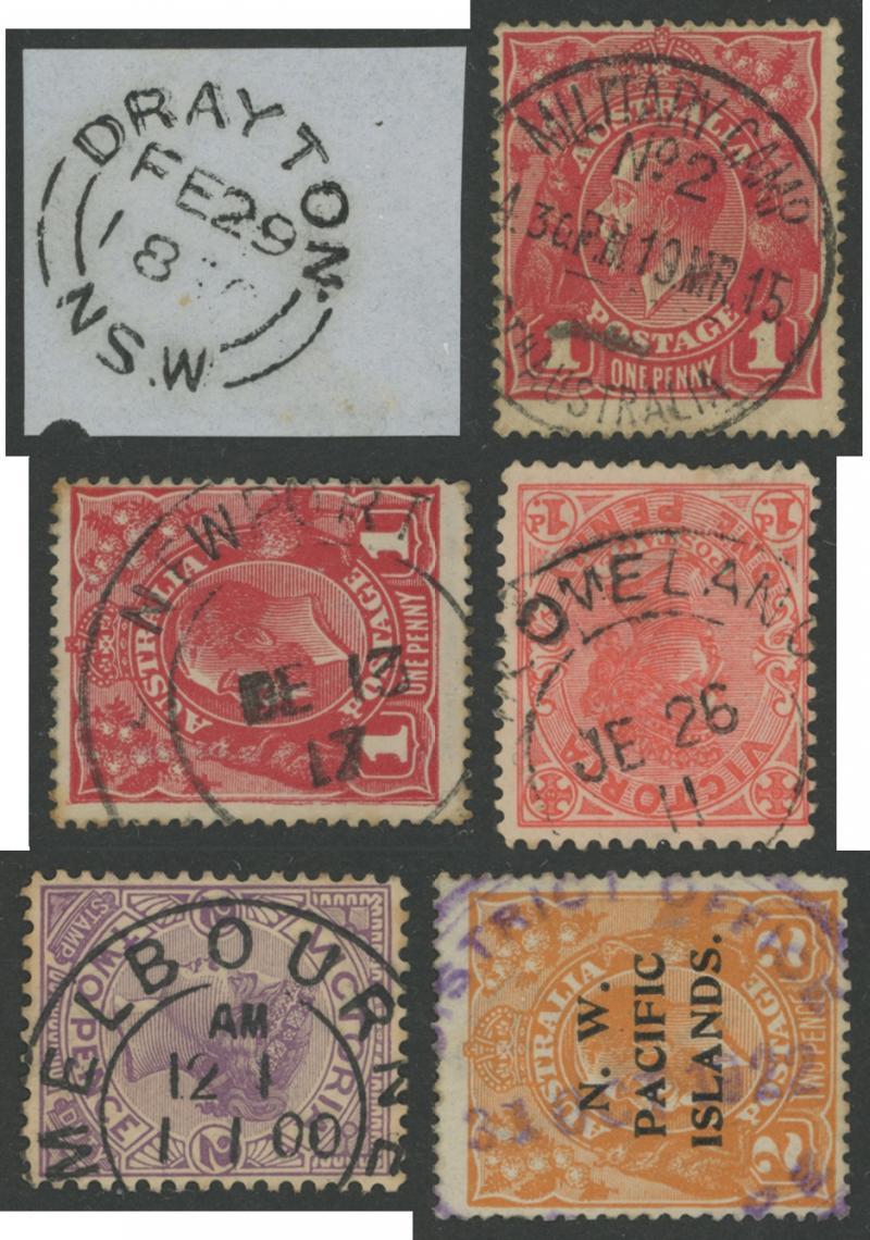 POSTMARKS: Quality selection including small 'DRAYTON/=NSW=' (Moreton Bay District), 'MURRAY LOCK No 8/ NSW'; South Australia with Diamond Numerals superb '116' & '245' (rated RR) on '8 PENCE' on 9d, 'MILITARY CAMP/No 2' on KGV 1d, 'STOCKADE' (1898), 'YARDEA' (1887), mostly very fine squared-circles the majority on KGV Heads including 'STURT/OC5/14/S-A' (in Receiving Office period); Victoria double-circle reliefs 'NEWPORT' (1917) & '[WO]OMELANG' (1911); Melbourne including double-circles notably five used on First Day '1.1.00' (with the numerals off the stamps), 'SUPT MAILS' in violet on Large Lyrebird 1/- block of 4, oval 'RECORDS' on KGV 1½d red block of 4, better stamps including Victoria Postal Fiscals 5/- rosine pair, Kangaroos First Wmk 6d block of 4 & punctured Small 'OS' 4d x2, also KGV Star 2d violet cut-out & two pieces with very fine strikes of the 'GOVERNOR-GENERAL/AUSTRALIA' Frank handstamp in blue; and New Guinea rubber '[DI]STRICT OFFICE/ 21OCT1922/'EITA]PE' on NWPI 4d. A very desirable lot for the serious collector.