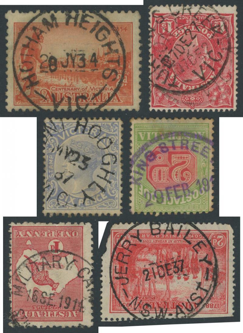 POSTMARKS: Duplicated array on hundreds of stockcards & hagners, strength in Pre-Decimal NSW and Victoria with a large number of KGV Heads & a decent range of Kangaroos & other better issues, selections of TPOs, MO&SB & other non-standard types, mostly part-strikes on single stamps but we have extracted many scarce to rare items and numerous very fine to superb strikes so proper examination is likely to be well-rewarded, condition variable. Ex Jimbo's Stamps (Jim Betson).