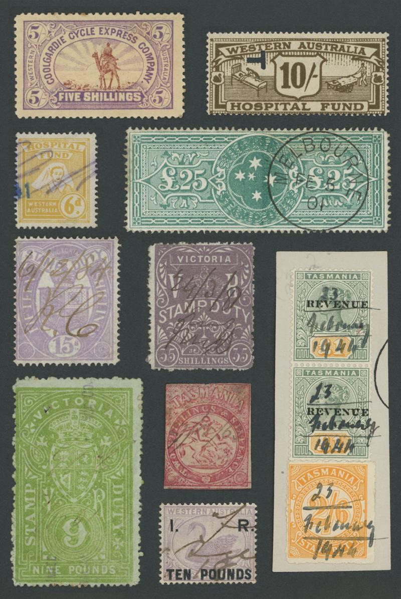REVENUES: Quality array on Hagners with strength in Victoria including Stamp Statute to £1, Large Stamp Duty with 15/- mauve, 35/- & a few CTO values plus the £6 to £9 values, Ultra High Values £25 (CTO) £50 & £100, 1886-96 £5 to £9, etc, NSW with Stamp Duty to £50, 'RELIEF/TAX' Overprints to £10 x2 & 'RELIEF' to 4/-, Tasmanian range including 'REVENUE/ 5d. ' on £1 pair on a flimsy invoice, Western Australia 'I. R.' Surcharges on 3d to 'TEN POUNDS', etc, also some Railway Stamps, a couple of Tasmanian Beer Duties (defective), WA Coolgardie Camels set with large-part sandy gum but a bit aged, and 'JOHN COOK/ ¼D /COUPON' block of 20 (faults), condition variable as should be expected but much is fine to very fine providing a solid foundation for a good collection.