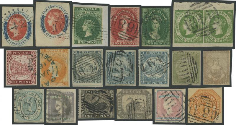 Valuable collection from a German source on large pages with NSW including Sydney Views 1d Plate II, 2d Plate I x2, 2d Plate II and 3d, Laureates with Numeral Wmk 1d & 2d strips of 5, Imperf 'REGISTERED' x3 (one a huge corner example); Queensland including Imperf 6d & an apparent 2d SG 2 but it has blind misplaced perfs through the design; South Australia London Printings 1d on small piece, 2d pair & 6d x2 and Adelaide Printings 2d blood-red pair & 1/- orange; Tasmania including Couriers 1d & 4d, Chalons Star Wmk 1d 2d & 4d pair; Victoria including Ham Half-Lengths 2d x2 & 3d, Woodblocks Imperf 2/- 'TOO LATE' & 'REGISTERED', Emblems Imperf Star Wmk 1d massive pair & No Wmk 2d strip of 4; Western Australia Penny Black x2, Litho 4d & 1/- x2, Hillman 6d; etc, and lot of later issues, also Australia with Kangaroos to 5/- CTO plus 'SPECIMEN' Overprints Type B 10/- & £2 and Type C £1 grey x2, Engraved 6d mint & CTO, Postage Dues 10/- postally used; plus a page of Samoa Express issues that are probably all reprints including blocks; finally some useful covers including 1852 stampless large-part entire Adelaide to "Holstein/Germany" and Tonga 1d multicoloured Postal Cards x2 to Germany. The condition is variable and we noted some forgeries and cleaned Tasmanian Chalons. However, all those mentioned here appear to be very fine to superb.