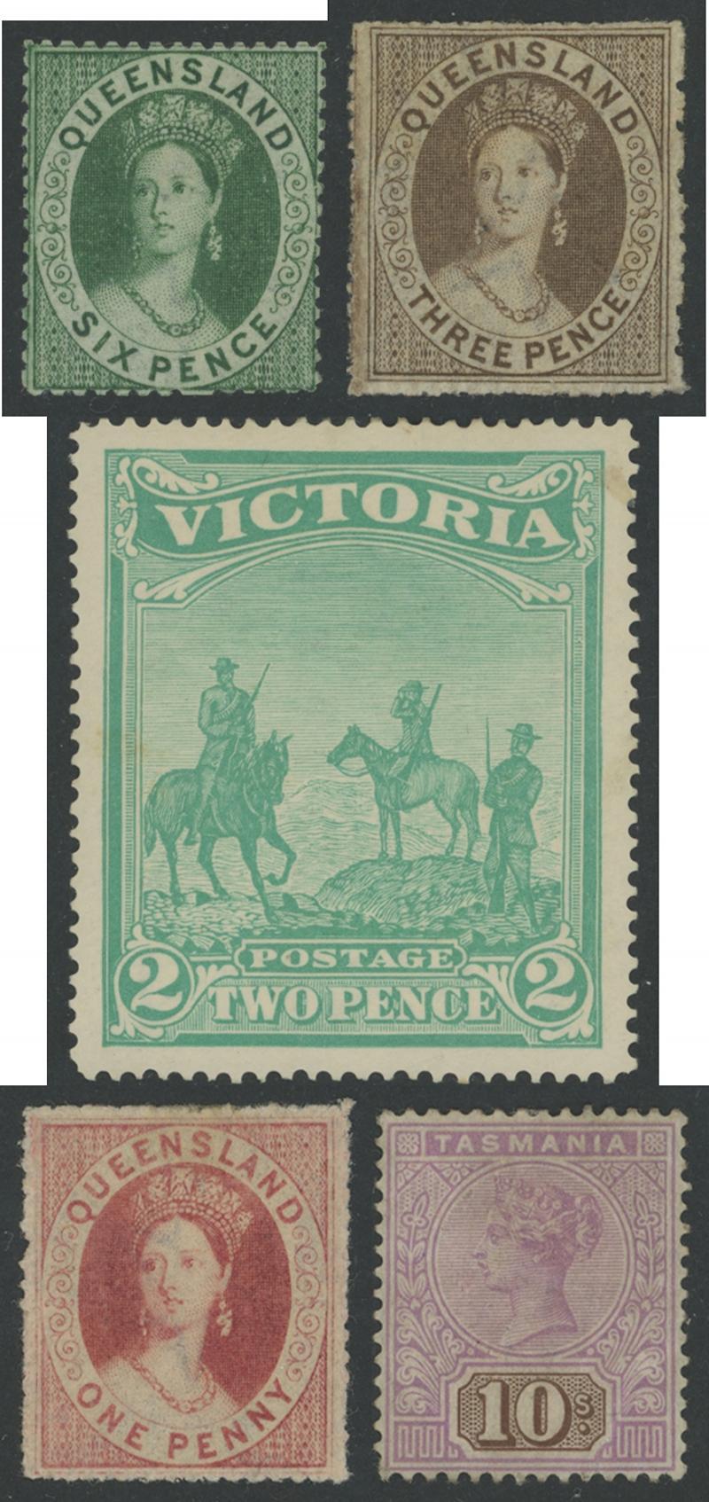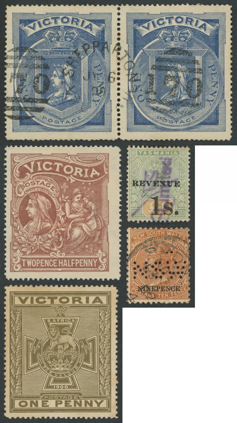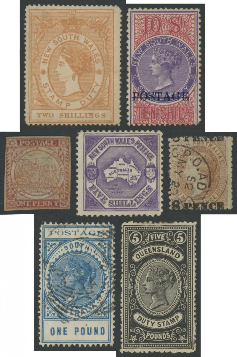 REVENUES: NSW Telegraphs 1d unused; Quensland Impressed Duty QV £300 & £500 both CTO with black cds, Railways ½d mint (very scarce) & 5/-; South Australia KEVII 50/- & £10; Victoria £100 overprinted 'RELIEF' with characteristic 'T' punches; and a few others, fine to very fine.
