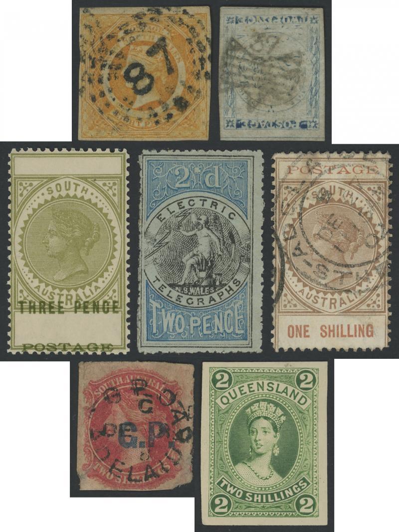 A really eclectic & disorganised selection with lots of better items including NSW Sydney Views 2d with Victorian Butterfly '37' cancel, Diadems Imperf 8d with margins close to good & superb Rays '87' of Ipswich (Moreton Bay District), Charity duo mint, Telegraphs 2d mint; Queensland Large Chalons 2/- imperf plate proof in green; South Australia 1855 Imperf 6d x4 and another on 1858 envelope to England, several proofs & posthumous reprinted proofs, Thin 'POSTAGE' 3d with Misplaced Tablets and 1/- Bicolour, eight Departmentals including 'G.P.' in Blue on 2/-; and Tasmania some attractive apparently postally used Chalons; condition variable but lots of potential here.