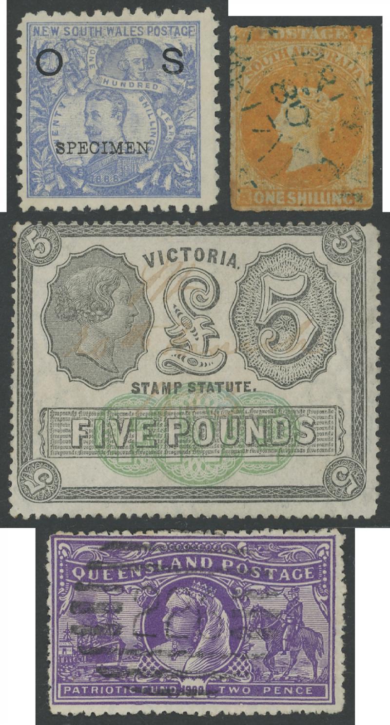 Collection mostly used in Seven Seas album with NSW 1850 Sydney Views to 3d, 1856 (6d) REGISTERED x2, 5/- Coin perf 'OS', Governors 20/- CTO, plus Specimen 5/- Map & £1 overprinted 'OS', 1897 Charity (both *); Queensland 1900 Charity duo, Revenues to 20/- used; South Australia 'Postage & Revenue' to 5/- mint or used; Tasmania QV Tablets to 10/-; Victoria Half-Lengths to 3d, 1897 Hospital Fund and 1900 Patriotic Fund (no gum) duos, KEVII £1 used, Revenues with Stamp Statute to £5 and Ultra-High Values to £100; Western Australia 1854 to 4d, 1902-12 to 10/-; condition variable.