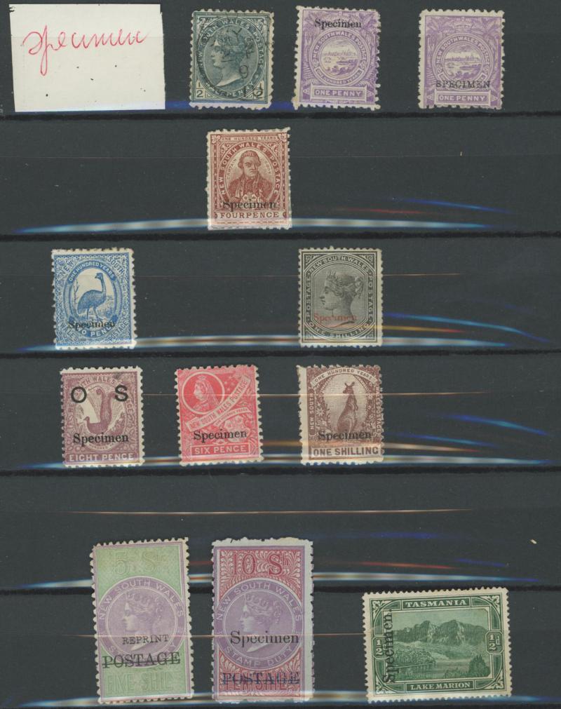 Small stockbook with Specimen overprints on NSW 1885-86 5/- & 10/- fiscals overprinted 'POSTAGE', 1886-87 Centennial to 1/-; South Australia 1902-12 'Postage & Revenue' £5; Tasmania 1892-1913 Tablet £1, plus Reprints; Victoria values to 1/6d; also Queensland QV Duty stamps to £1, Stamp Duty to £30; and double-perforated Qld 2d and SA 6d 'Postage & Revenue'; overall condition issues.