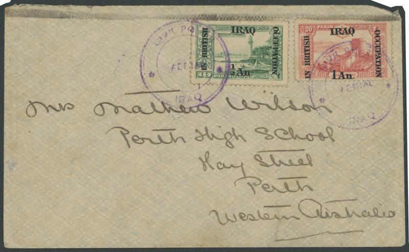 1920 social cover to "Perth/Western Australia" with Iraq '.../IN BRITISH - OCCUPATION' Overprints ½a on 10pa & 1a on 20pa tied by two strikes of the undated triple-ring 'CIVIL POST/ AERIAL /IRAQ' cancellation in violet (Proud AM1; recorded 13.5.1919 to 25.1.1920 only), the reverse with 'BAGDAD H.O.(IRAQ)/2JAN20/...' cds (Proud D11), Melbourne Krag machine of 22JE/1920 and 'PERTH/28JE20/WESTN AUSTRALIA' arrival cds, minor imperfections, with the enclosed Indian PPC with message on both sides headed "Baghdad 24.1.20" which states "This is to give you one of the first letters by aerial mail to Australia...", AAMC 26, Cat $3250. A rare and important cover from the England-Australia Air Race. Illustrated in Volume One at pages 184-186.