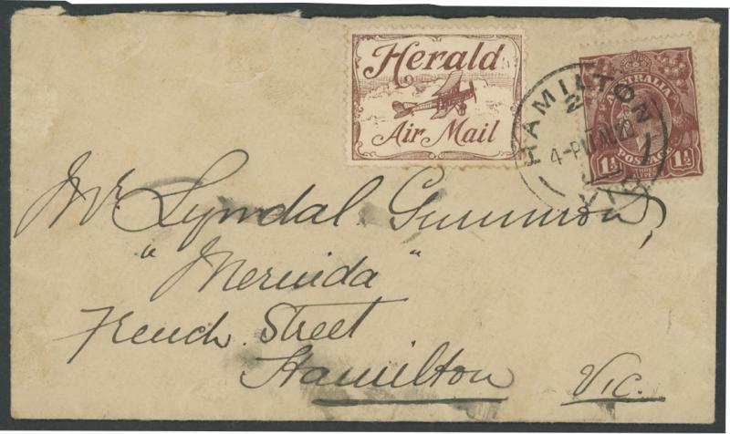 1920 (Aug 10) apparently commercial cover from Melbourne to "Merinda/French Street/Hamilton Vic" with KGV 1½d brown cancelled on arrival with 'HAMILTON/ 2 / 11AU20/VIC' cds also tying 'Herald/[plane]/Air Mail' label (minor perf faults) affixed alongside, minor ink-smudging & small repaired tear at upper-centre well clear of the adhesives, AAMC 48, Cat $1800. The AAMC states that 700 items were carried but that "only about 50" have been recorded. The 'incident' was loss of daylight (!), causing an unscheduled overnight stop at Willaura, only 70km short of Hamilton. See Volume One at pages 5-8, illustrated at page 6. (Image1)