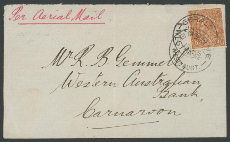 1921 (Dec 19) cover endorsed "Per Aerial Mail" to Carnarvon with KGV 5d tied by 'GERALDTON/ 3DE21/WESTN AUST' cds and 'BROOME/19DE21/WESTN AUST' cds, minor blemishes & light central fold, AAMC 57b(var), Cat $1250+. Illustrated in Volume One at page 26 where stated to be the only cover flown on both the inaugural north-bound flight, suspended because of the fatal crash, and the first south-bound flight, which became bogged at Cape Latouche. This came about because when the 'Bambra' carried the mail that had been returned to Perth, this cover was mis-sorted to the more northerly port of Broome. (Image1)