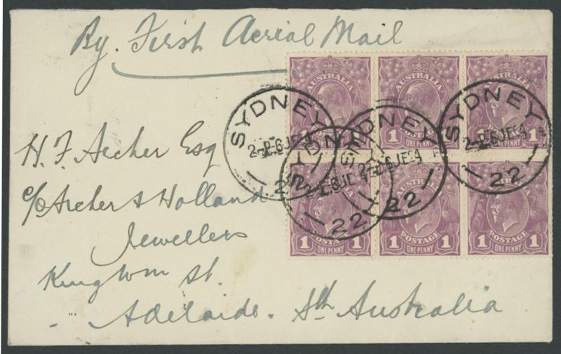 1924 (June 7) cover endorsed "By First Aerial Mail" with KGV 1d violet block of 6 (3x2) tied by 'SYDNEY/6JE24/ 22 ' cds, AAMC 72, Cat $550. Illustrated in Volume One at page 61. Delayed by engine trouble. (Image1)