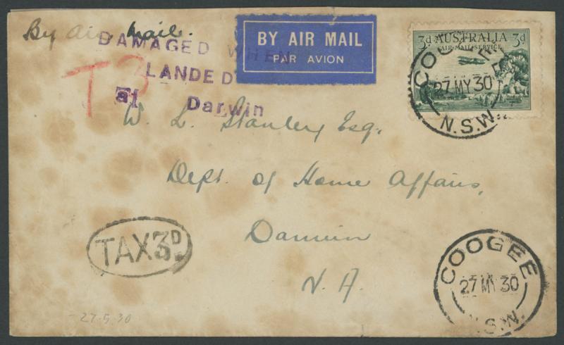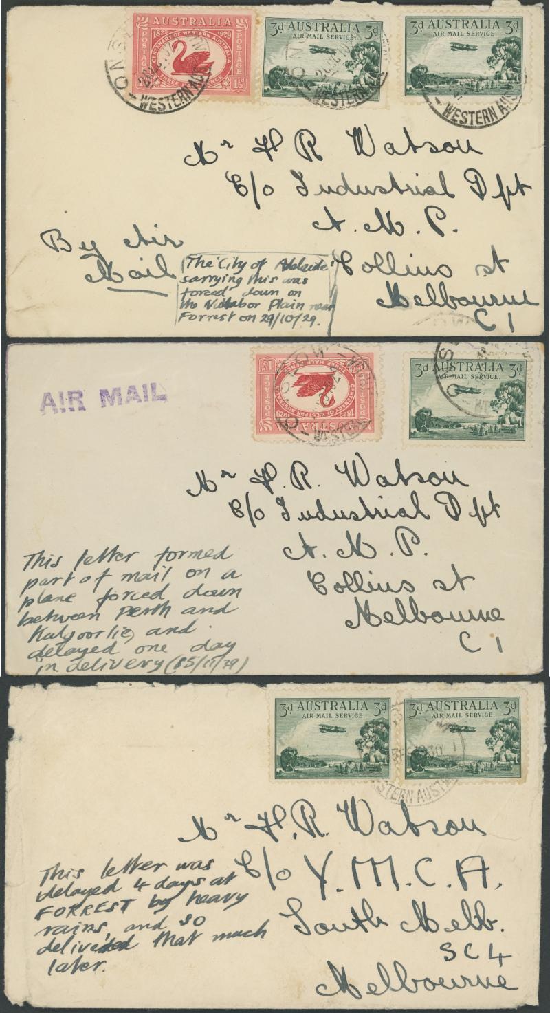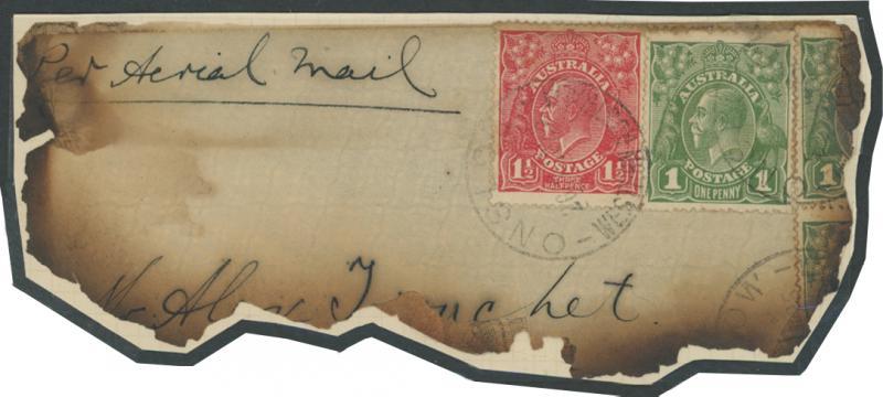 1925 (Jan 26) charred remains of a cover endorsed "Per Aerial Mail" with KGV 1d green x3 & 1½d red tied by light 'ONSLOW/WESTERN AUSTRALIA' cds, with the PMG's Department (Perth) roneo'd letter about the incident, AAMC 74, unpriced. Ex Carl Hardman-Smith. Both illustrated in Volume One at pages 66-67. Only one intact cover and one other part-cover are recorded. The aircraft was preparing for take-off at Onslow when the engine backfired, igniting petrol fumes, the fire destroying the aircraft.