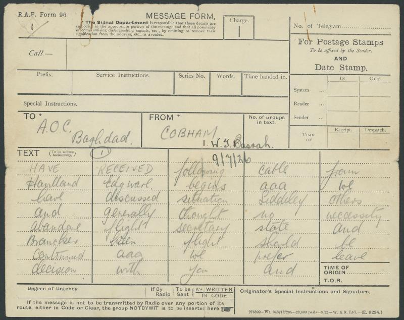 1926 (July 9) handwritten telegram 'MESSAGE FORM' 1) to "AOC/Baghdad" from "Cobham" advising response from de Havilland in England re Elliott's death including "... no necessity abandon flight" and re his replacement "can you arrange local airforce select suitable man ministry will authorise ..."; 2) of same date to Cobham "... very anxious no raf mech ... unless he is fully qualified ... also whether he is willing to volunteer ..."; and 3) of same date from Cobham "... name of mechanic suggested sgt ward ... has been instructor on jaguar ... ward is very keen to volunteer at same rate pay as elliott ..."; minor peripheral damage & reinforced with archival tape along central folds. Fascinating & important documents that highlight the speed of telegraphic communication 100 years ago. Remarkable survivors.