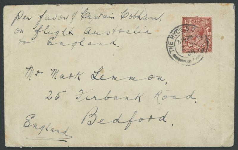1926 (Sep 4) return flight Darwin-England to "His Royal Highness/Prince of Wales/..." with Great Britain KGV ½d green & 1d red (faded) cancelled on arrival by 'THE HYDE SO NW9/2OC/26' cds, signed "Alan J Cobham" on the reverse, light central fold & light soiling, AAMC 101 (18 carried), Cat $2750. Illustrated in Volume One at page 196. Four days into the trip, a tropical rainstorm required a forced landing where a hole was discovered in one of the floats. In the following week, four more days were lost to torrential rains. (Image1)