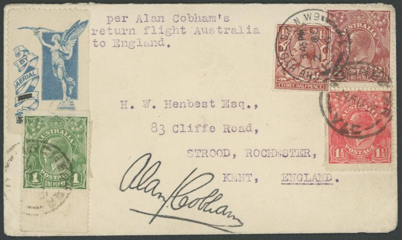 1926 (Sep 4) return flight Darwin-England unusually with combination franking of KGV 1d green, 1½d red & 2d brown tied by 'ROCHESTER/VIC' cds and Great Britain KGV 1½d brown cancelled on arrival by 'THE HYDE SO NW9/2OC/26' cds, signed "Alan J Cobham" on the face, light central fold & light soiling, AAMC 100, Cat $3500. With a very fine real photo PPC of Cobham and the accompanying 1954 letter signed "Alan J Cobham" in which he attests to the cover being genuine, having been "thrust into my hands by an Indian student in Australia before my departure ... I think Sergeant Ward ... got the cover stamped in Australia". Both items illustrated in Volume One at page 198.