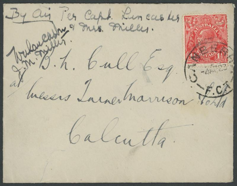 1927 social cover endorsed "By Air Per Capt Lancaster/& Mrs Miller" to Calcutta with the enclosed note headed "216(B) Squadron/Heliopolis/30.10.27" introducing Lancaster and requesting that the addressee "show him the ropes", however, Lancaster forgot to deliver the cover, arriving Darwin 19.3.1928, five months after departing England. Carried on the return flight with KGV 1½d tied by 'CANBERRA/4AP28/FCT' cds and 'CALCUTTA GPO/DELY/30APR28' arrival backstamp, signed at upper-left "WA Lancaster" & "JM Miller". Unlisted in the AAMC. Only two covers were carried from England, & they were probably destroyed. This is therefore the only surviving cover, enhanced by its epic trip Egypt-Calcutta-Australia-Calcutta.