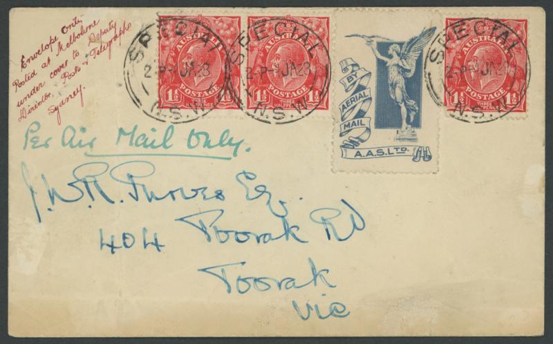 1924 (June 7) cover endorsed "Per first aerial mail/Sydney to Adelaide" with KGV 1d violet 1½d red & 2d brown tied by 'DELIVERY ROOM/7JE24/GPO SYDNEY' cds, minor blemishes, AAMC 72, Cat $550. Illustrated in Volume One at page 61. Delayed by engine trouble. (Image1)