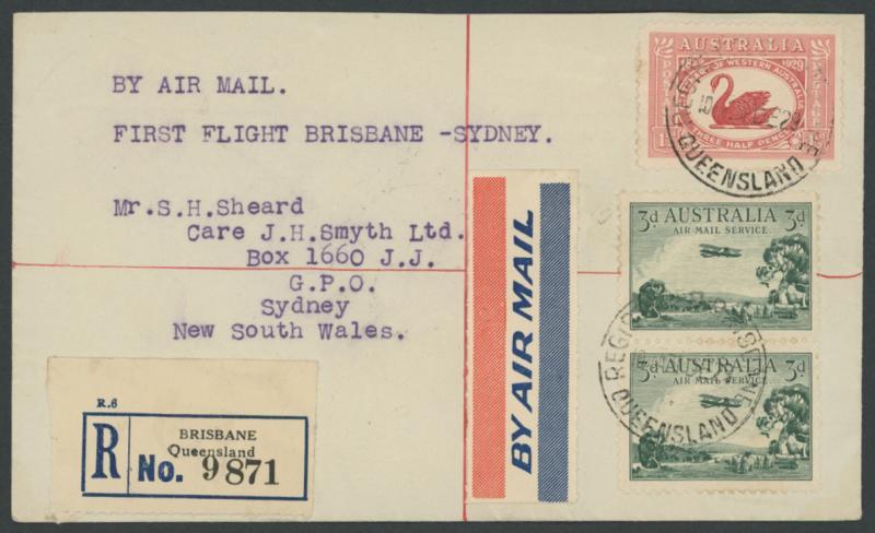 1932 (Sep 18) Inaugural Sydney-Brisbane Sunday Service usage of KGV 2d Envelope with 3d Airmail tied by Sydney cds of 17SE32, toning especially on the reverse, AAMC 282, Cat $600. Carried per DH80 Puss Moth that crashed north of Lismore (NSW) after one of the wings fell off, killing all on board. Only about 12 covers are recorded.