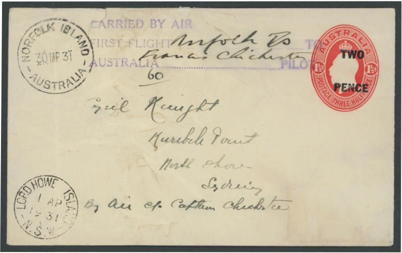 1931 (Mar-Apr) usage of 'TWO/PENCE' on KGV Oval 1½d Envelope with very fine 'CARRIED BY AIR/FIRST FLIGHT ("Norfolk Is") TO/AUSTRALIA ("Francis Chichester") PILOT' cachet in violet & endorsed "60" with cds of 'NORFOLK ISLAND/30MR31/AUSTRALIA' & 'LORD HOWE ISLAND/ 1AP/1931/NSW', a bit crumpled & with ironed-out vertical crease at left, AAMC 183, Cat $950. Illustrated in Volume Two at page 140. While moored overnight at Lord Howe Island, a gale flipped the plane, requiring it to be dismantled and rebuilt. (Image1)