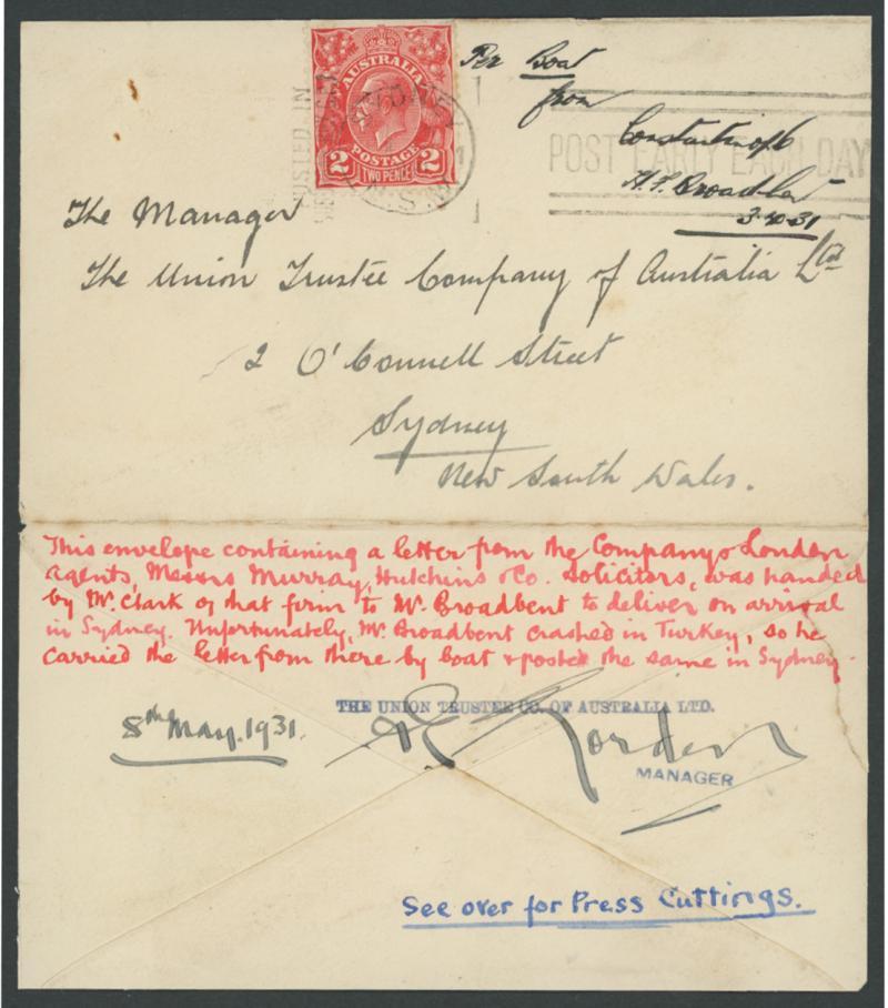 1931 (Mar-Apr) stampless cover from a legal firm in England carried per favor of Harry ('Jim') Broadbent to a trustee company in NSW, endorsed "By Boat/from/Constantinople/HF Broadbent/3.4.31", on arrival KGV 2d red added for local delivery tied by Sydney slogan cancel, certified on the reverse by the trustee company's manager, opened-out & slightly-reduced for display, AAMC 185, Cat $1500 but the only recorded item. Ex Tom Frommer: sold at our auction of 11.9.2016 for $1340. Illustrated in Volume Two at page 144.