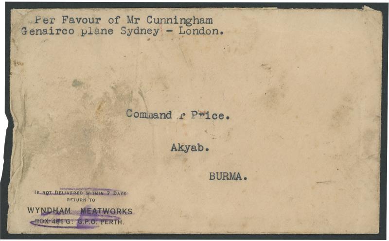 1931 (July) Wyndham Meatworks (WA) stampless cover to Burma by Australia-England flight per 'Genairco' piloted by Andrew Cunningham who made four forced-landings in swamps (!) near Bourke (NSW), on Flores (Dutch Indies), just short of Singapore Airport, and on Ramree Island (Burma), overall soiling & piece of the flap missing. Unlisted in the AAMC. The only recorded cover from this flight. After his various mis-adventures, Cunningham abandoned the flight on 16.10.1930. (Image1)