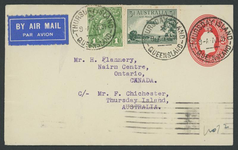 1931 (July) Australia-Japan per 'Madame Elijah' usage of KGV Oval 2d Envelope to Canada uprated with KGV 1d green & 3d Airmail tied by 'THURSDAY ISLAND/ 2 /7JL31/QUEENSLAND', the reverse with Manila slogan of JUL24/1931, Japanese-language arrival & large cachet '...NO ("72") OF ONLY 145 CARRIED FROM AUSTRALIA...' signed by the pilot "Francis C Chichester", AAMC 210, Cat $525. See Volume Two at pages 156-162 & illustrated at page 160. The flight was delayed in Manila for 19 days to effect repairs. Taking off from Katsuura Bay in Japan, the plane clipped a telegraph wire & crashed. Chichester was critically injured, but recovered. His plane was a write-off. (Image1)