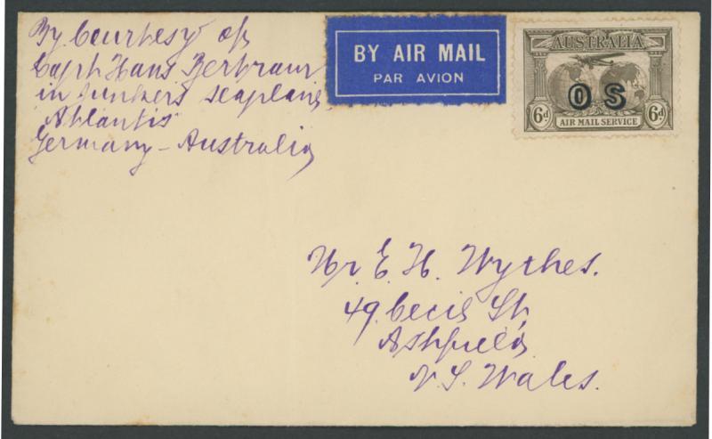 1932 (Dec 12) Australia-England-Australia boomerang cover with 'BERTRAM ATLANTIS/ [propellor]/EXPEDITION' cachet, 2d Kingsford Smith & 6d Air overprinted 'OS' tied by 'DARWIN NT/AUSTRALIA' cds, signed "Hans Bertram" across the cachet, light soiling, AAMC 242, Cat $1750.