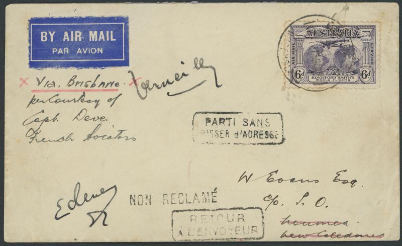 1932 (Apr 5) Australia-New Caledonia per French aviators Charles de Verneilh, Emile Munch and Max Deve with KSmith 6d tied by poor Brisbane cds of 30MR32, the reverse with very fine strike, 'NOUMEA/6-4/32/...' arrival & unframed 'NON RECLAME' (= unclaimed), the face with boxed 'PARTI SANS/RISSER d'ADDRESSE' (= left without a forwarding address) & boxed 'RETOUR/A L'ENVOYEUR' (= return to sender), 'NOUMEA/27/AVRIL/32/...' backstamp, signed "Verneilh" & another unidentified, minor blemishes, AAMC 254 (8 carried), Cat $1500.