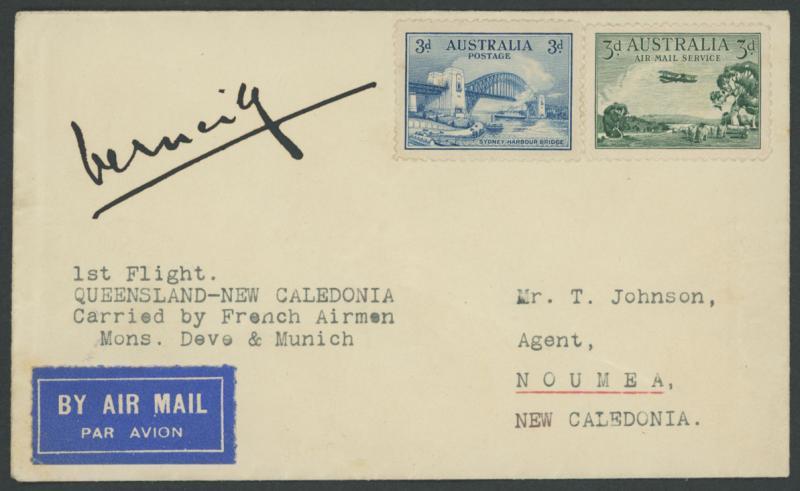 1932 (Apr 5) Australia-New Caledonia per French aviators Charles de Verneilh, Emile Munch and Max Deve with 3d Airmail & 3d Bridge but uncancelled, signed "Verneilh", AAMC 254 (8 carried), Cat $1500. Returned in long cover (vertical fold) of 23-4/32 with covering letter "... I fear it is of no value as it is not postmarked ... I however obtained Mr de Verneilh's autograph".