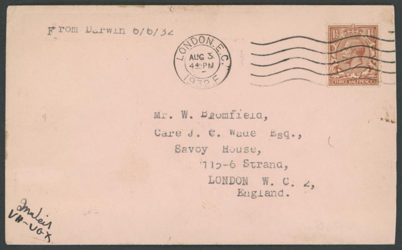 1932 (July) cover to London carried privately by the pilot James Weir from Darwin with his signature at lower-left, the flight interrupted by monsoons in Malaya & damage caused in a poor landing at Karachi where the flight was abandoned due to Weir falling ill, AAMC 265 (two carried), Cat $1500. Illustrated in Volume Two at page 209, where two other covers are recorded.
