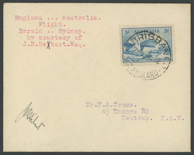 1932 (Oct-Dec) England-Australia per the French-Canadian Jacques Hebert who had a largely trouble-free flight until landing at Cloncurry (Qld) where he took evasive action to avoid a flock of goats, flipped and destroyed his plane, Harbour Bridge 3d only affixed & cancelled on arrival at 'BRISBANE/12DE32/...', signed by the pilot at lower-left. Unlisted in the AAMC. See Volume Two at pages 216-219, where Brian Peace states that only 12 covers were flown to Brisbane. Hebert sold the wreck of his plane in situ to the locally-based Qantas. (Image1)