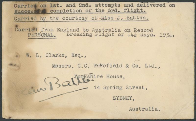 1933-34 remarkable CC Wakefield & Co envelope carried on all three of Jean Batten's flights from England, the first ending with a major crash at Karachi, the second with a crash at Rome, the third relatively uneventful - apart from being bombarded with embers from a volcanic eruption en route to Timor - and successful, signed by the pilot at lower-left, light (oil?) staining at left, AAMC 301 (only three covers carried; unpriced), 375 (Cat $1000) and 376 (Cat $2500). This is the only cover that was carried on all three flights. With her third flight, Batten broke Amy Johnson's women's record by more than four days! Ex Tom Frommer (private transaction). See Volume Two at pages 234 (where illustrated) to 244. (Image1)