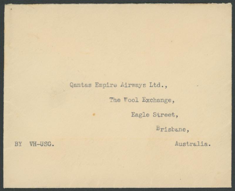1934 plain unstamped cover addressed to Qantas in Brisbane & endorsed on the reverse by Hudson Fysh "From crash ... /near Longreach 15.11.34/Capt Prendergast and crew all killed", a couple of hinge remnants otherwise superb. Unlisted in the AAMC. See Volume Two at pages 66-71: illustrated at pages 70-71 and stated to be the only recorded item from this fatal crash. This was the delivery flight from England: the plane was carrying a spare engine, causing disruption to the its centre of gravity. (Image1)