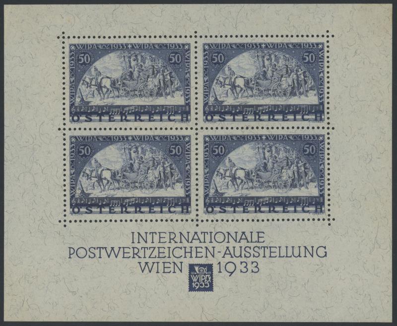 1933 WIPA Philatelic Exhibition 50g+50g Mail Coach M/S SG MS705 (Michel Block 1), lightly mounted in addition to the usual adhesion spots in the top margin, Cat £3500 (€2600). (Image1)