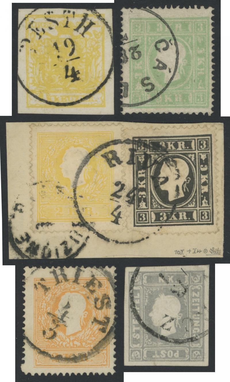 Collection from Classics including 1854 1k yellow Type III very fine with large margins and 'PESTH' cds (Albert Matl (1986) & Ulrich Ferchenbauer (1994) Certificates), 1858 Franz Joseph set comprising Types I & II of each of the 2kr yellow, 3kr black, 5kr red, 10kr brown & 15kr blue the Type I 2kr yellow & 3kr black (corner fault) together on piece tied 'RIVA' cds, plus 2kr orange (Ulrich Ferchenbauer (1995) Certificate), 3kr light green (Ulrich Ferchenbauer (1995) Certificate) and a darker shade on small piece, also Newspaper Stamps Imperf 1858 (1k.05) blue margins good to just touching at left & 1861 (1k.05) grey margins large all around, then an extensive range of postmarks mostly on 1867-1890 Franz Joseph Heads plus a couple on covers one with superb 'POZECA' 1870 cds, the strikes generally well above-average, condition a little variable but mostly fine to very fine, Cat £4000+.
