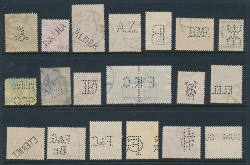 COMMERCIAL PERFINS: Collection of pre-WWII types 'A' to 'ZOZ' with many unusual patterns & a large number on non-base-rate stamps, various multiples, some on-piece & two covers, some postmark interest, condition variable. Also checklist 'A' to 'ZZ/LL' by John Nussbickel and for Austrian Levant.